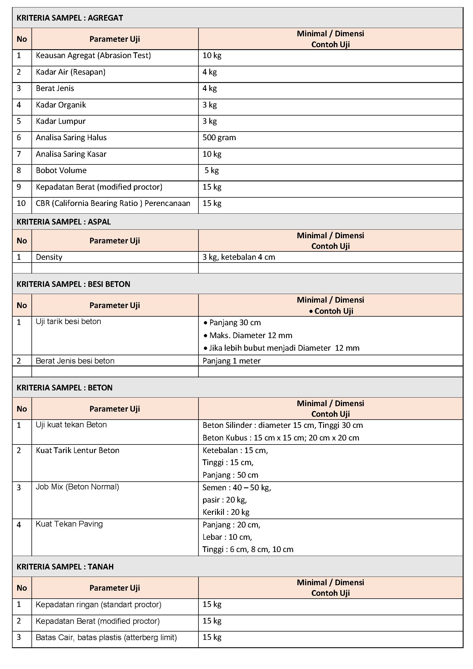 Kriteria dan standar yang harus dipenuhi oleh suatu sampel untuk memastikan bahwa sampel tersebut benar-benar mewakili karakteristik yang akan diuji dan dapat diandalkan hasilnya. Apabila contoh uji atau sampel berupa cairan untuk pengujian seluruh parameter uji dibutuhkan volume sampel sebanyak minimal 5 Liter contoh uji, sedangkan pengujian yang hanya beberapa parameter saja dibutuhkan sampel sebanyak 2 – 3 liter contoh uji
